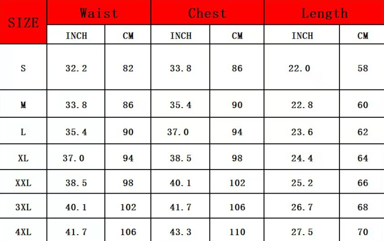 | Size | Bust | Waist | Hips |